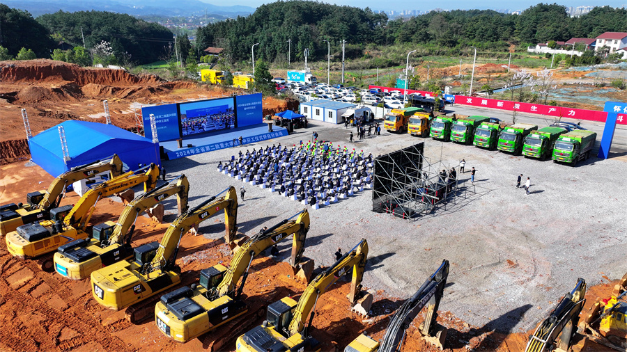 活动现场,一辆辆工程车排列整齐、整装待发,一名名建设者精神抖擞、斗志昂扬。