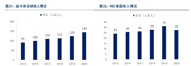 在欧美等发达国家,户外运动已流行多年,因此欧美品牌已经基本占据了中高端户外用品市场,如始祖鸟、北面等,它们已通过多年的研发和营销投入,形成较强的专业性壁垒。零售商方面,海外也已形成大型零售商,如欧洲的迪卡侬和美国的 REI,两公司都以全品类大门店的模式实现高收入。它们基本都覆盖全部户外品类,同时门店面积至少在 2000 平米以 上。