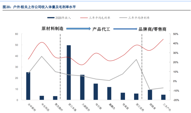 我国上市公司多处工厂制造环节,零售端尚未有规模较大的企业。户外用品具备较强专业性,对于防水防风、保温、轻量化等功能要求比较高,有一定的研发制造门槛。
