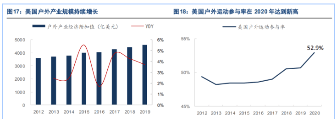 美国户外运动产业规模和参与率均存增长空间,疫情加速效果有望留存,我国外销业务仍具机会。美国户外运动已处于成熟期,整体参与率处于很高水平。