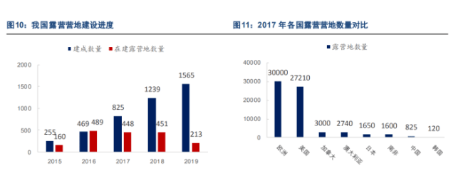 我国露营营地近年来保持较快的上涨的速度,根据露营天下数据,2019年我国已有1565个露营基地,在建 213 个;在2018年,已有近半数营地接待近 7 万人次,旺季出租率达96%。但我国露营营地数量与欧美相比,仍有近 20 倍的差距,未来供给端发展空间依然广阔。
