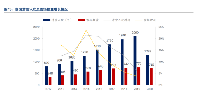 在政策和需求的共振下,冰雪产业实现较快发展,场地的开拓带动了参与人次的增长,2015-2019 滑雪人次 CAGR4 在 14%左右。