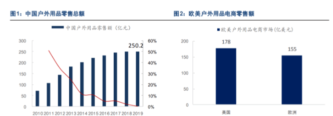 根据纺织协会对专业品牌和渠道的统计,2019年我国户外用品零售总额 250 亿元,而根据Statista数据,2019 年美国、欧洲仅线上户外用品零售额就分别达到 178 亿美元、155 亿美元。因此,我国户外运动参与率和消费支出两方面都有较大提升空间。