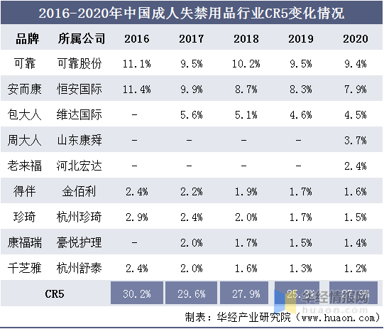 但随着成人失禁用品行业的持续不断的发展,各中小企业开始通过升级产品、降低价格等方式来获取一定市场占有率,因此2016-2020年我国成人失禁用品行业CR5整体呈下降的状态。