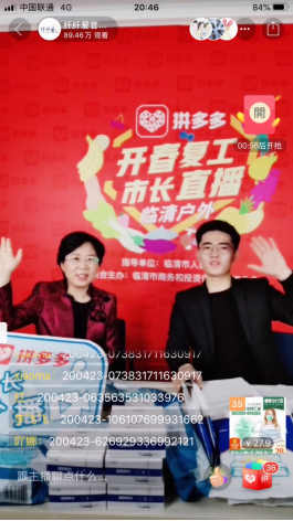 4月23日晚间,山东临清市委副书记、市长祁学兰出现在了拼多多直播间,为广大购买的人的五一出行提供了“安全出行套餐”——口罩、酒精棉片以及一次性床单被罩等。