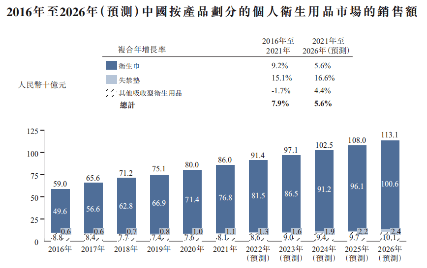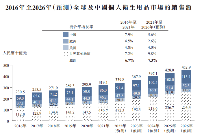 全球个人卫生用品市场销售总额由2016年的人民币2,305亿元增至2021年的人民币3,191亿元,复合年增长率为6.7%。预计未来五年市场将一直增长,2026年将达到人民币4,529亿元,2021年至2026年的复合年增长率为7.3%。