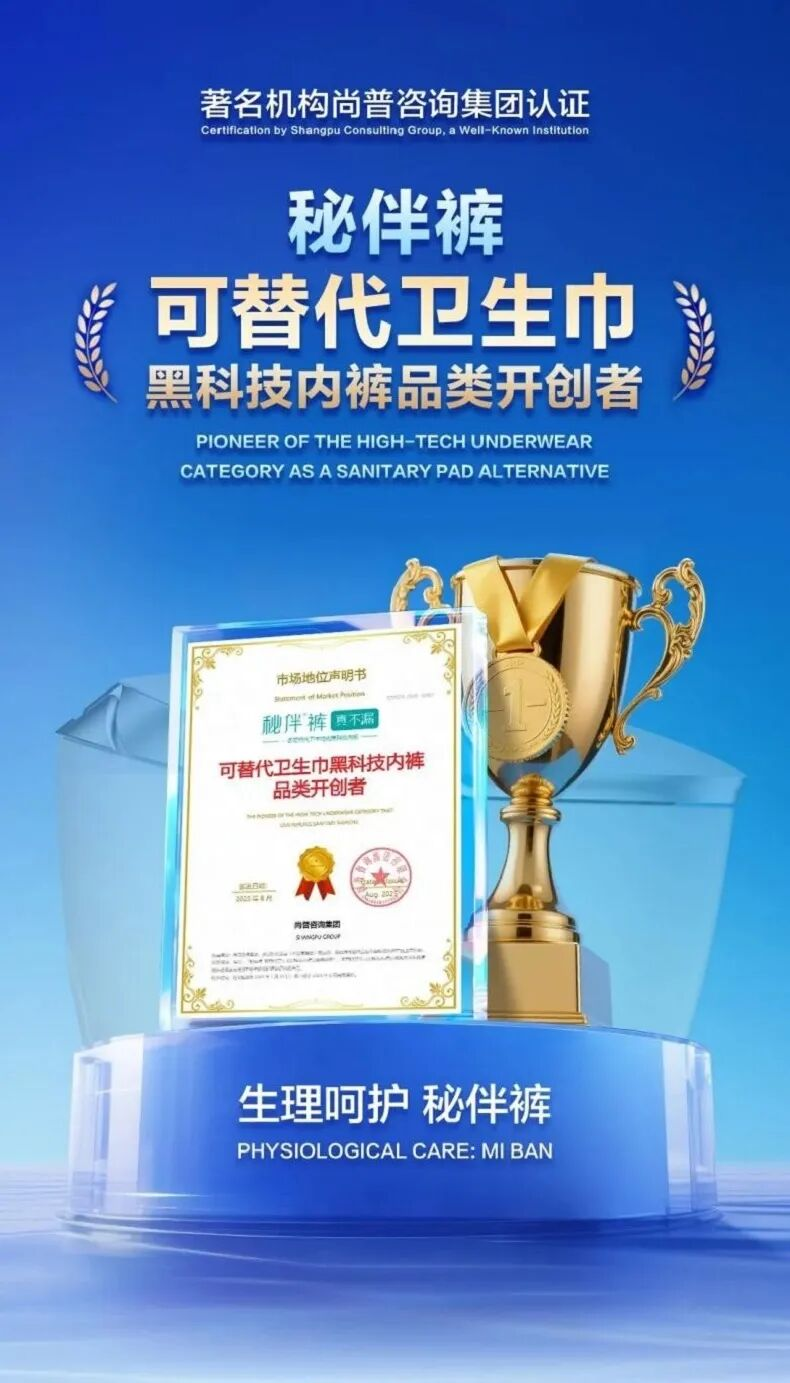 2025年8月,尚普咨询集团对可替代卫生巾黑科技内裤市场开展了专项研究,从行业趋势、竞争格局、企业产品等方面针对行业进行了全面、系统、深入的调研,以呈现秘伴裤在行业中的市场地位。此次,秘伴裤荣获尚普咨询集团颁发的“可替代卫生巾黑科技内裤品类开创者”市场地位声明,这不仅凸显了秘伴裤的实力与市场影响力,更标志着其在可替代卫生巾黑科技内裤领域的领头羊,为可替代卫生巾黑科技内裤行业高水平发展树立了标杆。